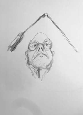 er wird wach und ich erzähle ihm diesen gedanken. er blickt sich um, bemerkt all diese schuhe und ist sichtlich verlegen. er begreift und es ist ihm peinlich. er ergreift meinen arm. es ist ihm einfach noch nie aufgefallen. hausschuhe als gedanken, die er immer wieder vergisst, wiederholt und neu irgendwo abstellt. was haben schuhe mit denken zu tun? kann man seinen kopf mit immer wieder denselben hausschuhen vollstellen? vorstellung und vollstellung?