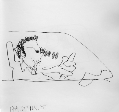hatte ich das schon? letztens abends im garten sitzend nach dem heckenschneiden? drüber sinnierend, wie man den straßenlärm, der zu uns leise aber stetig vordringt, in linien fassen könnte? diese zeichnung ist keine antwort auf diese frage. diese frage entstand während des zeichnens dieses blattes. und hat damit rein garnix zum tun. alles ist biographisch. auch das erfundene. hab ich heute abend im fernsehr gelesen und komplettamente vergessen, wer es ausgesprochen hat. claude simon? ich glaube, der war’S.