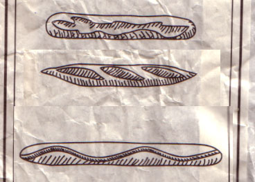 Diese drei Meisterwerke der Baguette-Zeichnerei fanden sich auf der papiernen Brotverpackung des fahrenden Verkaufsstandes Fluteköppche aus Bouzonville, der sich, von mir erst vor drei Wochen entdeckt, einen Platz auf dem samstäglichen Wochenmarkt in Neunkirchen/Saar (dort wo sich das Arbeitsamt befindet) erobert hat. Eigentlich wäre die Tüte wahrscheinlich ein Fall für Harri Brill, aber auch für den Liebhaber der Zeichnerei ein erquickliches Beispiel. Autor der Zeichnung leider unbekannt.